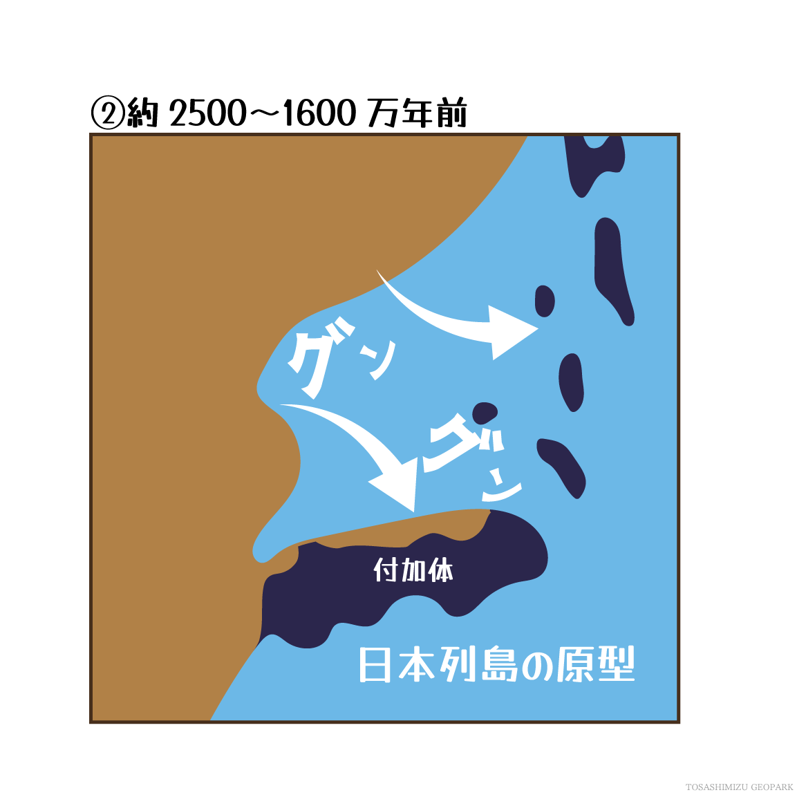およそ2500万年前ごろから1500万年前にかけて、中国大陸の東の端 が裂 けて大陸の一部が現在 の日本列島の位置に動いてきました(②)。これが日本列島の原型 です。