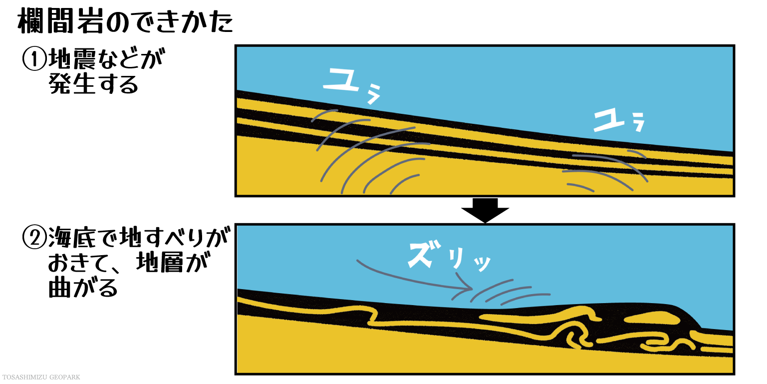三崎層群 の中には、地震 、津波、海底で起こった地すべりのあとが残っています。また、三崎層群 がたい積した海は、砂 やどろが大量に流れ込み、生き物が少ない海であったと考えられています。