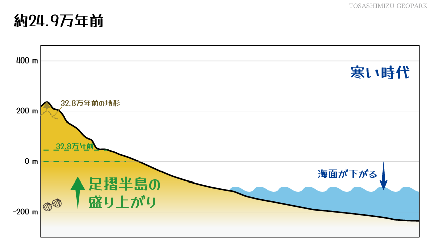 あたたかい時代は、海面が上がって、海岸を波が削 って平らな地面ができます。寒い時代になると海面は下がりますが、その間も足摺半島 はずっと盛 り上がり続けています。